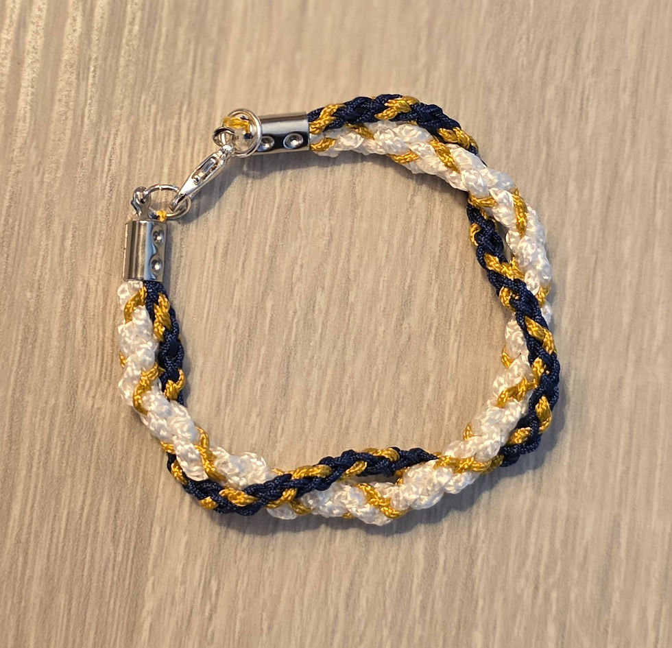 Woven white cotton rope with red and blue paracord, lobster claw clasp.